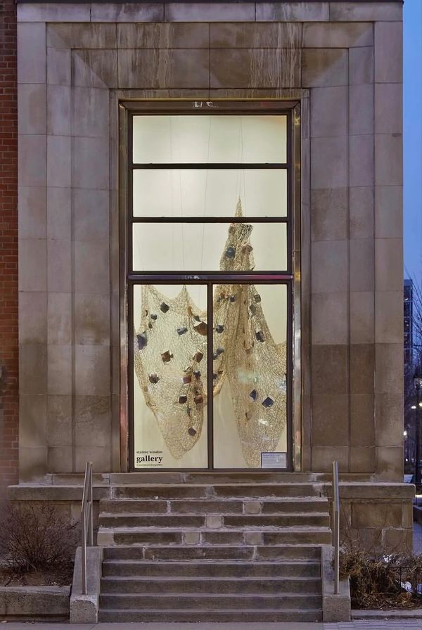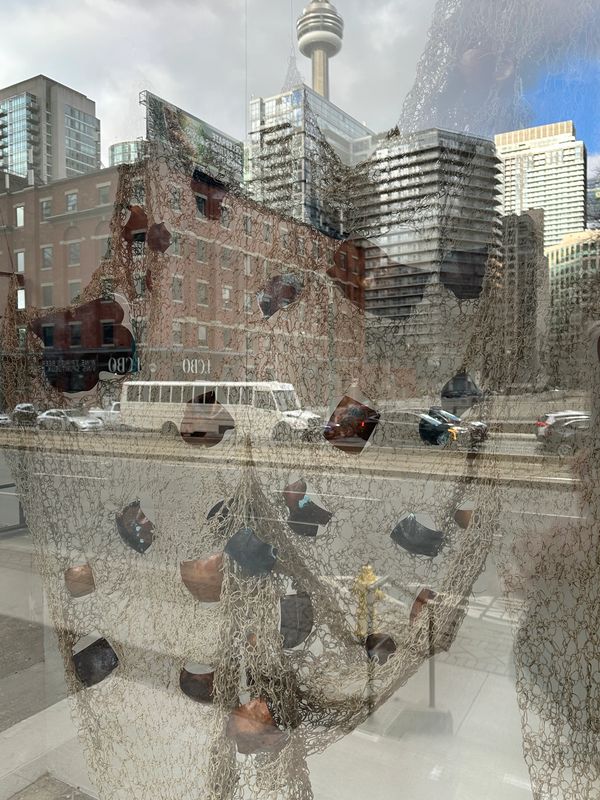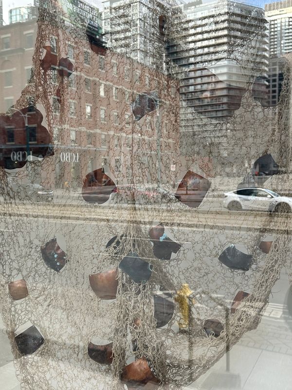 Remnants for the Future considers how identity is shaped by what is carried, inherited, and reconstructed. In a former garment district, this installation becomes a poetic echo of labor histories — domestic and industrial, visible and obscured. It speaks to fragmentation and resilience, offering a slow, tactile counterpoint to the velocity of urban life just outside the window. Its porous, mesh-like surface mediates visibility — a metaphor for diasporic presence that is both seen and filtered through layers of history and place.