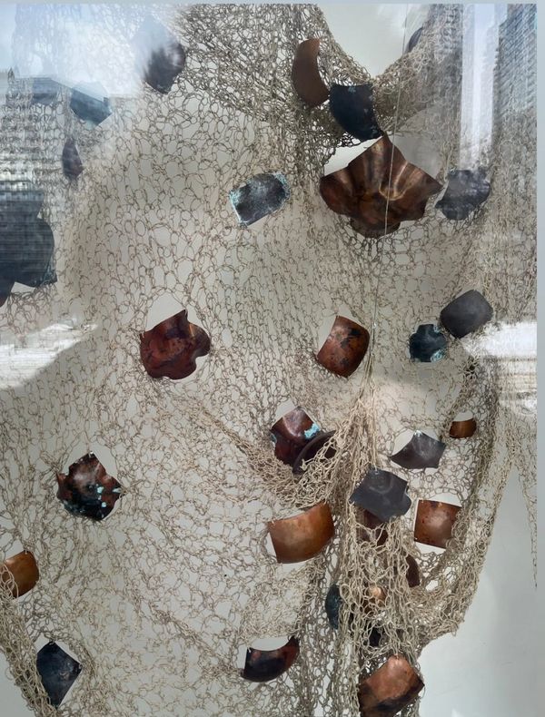 Remnants for the Future is a site-responsive textile installation that reflects on diasporic memory, inherited traditions, and cultural hybridity. Originally presented as a large-scale immersive sculpture, the work is composed of hand-knotted net structures using undyed natural fibers, embedded with organic copper fragments. These forms resemble clay vessels, stones, or charred remnants — evoking the domestic, the archaeological, and the ancestral.